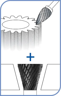 • High performance multipurpose bur combining a tree shape and an inverted cone shape for efficient grinding of complex parts