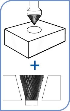 • High performance multipurpose bur combining a countersink 60° shape and an inverted cone shape for efficient grinding of complex parts