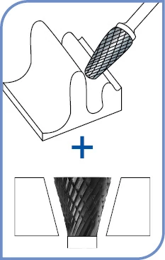 • High performance multipurpose bur combining a ball nosed cone shape and an inverted cone shape for efficient grinding of complex parts